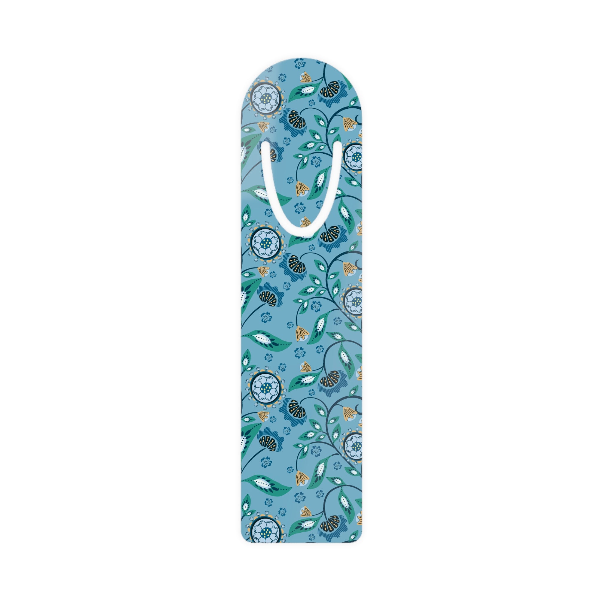 Lightweight and smooth, this aluminum bookmark slips into pages without bulking the book and holds its place with a clever U-shaped slot at the top. The front side shows bright, crisp printed artwork — here a gentle blue floral pattern with leafy vines. A thoughtful gift for book lovers of all ages.
