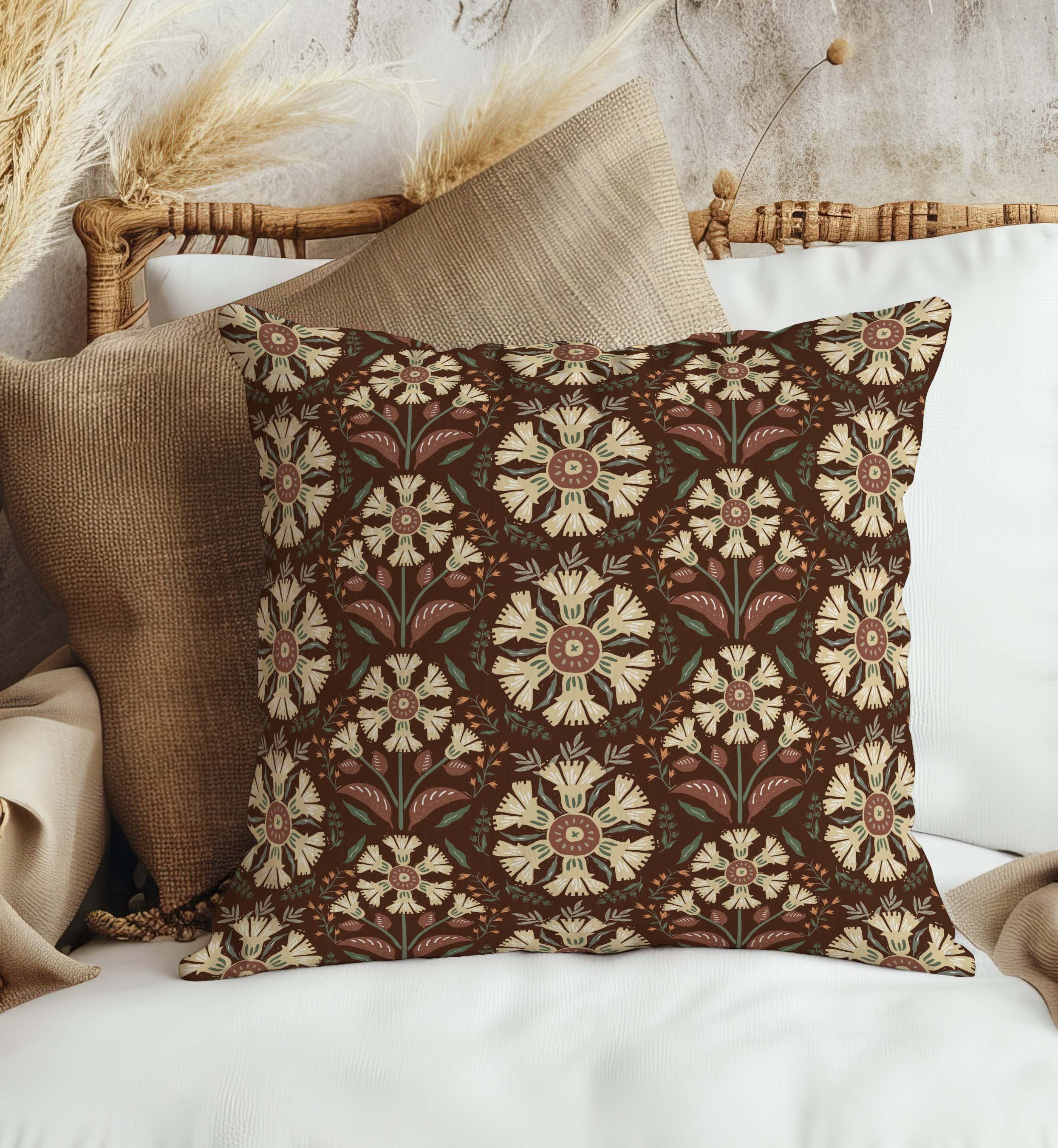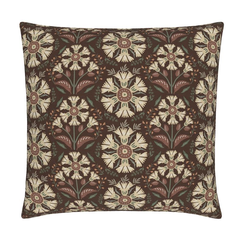 Hand carved linoleum block print blossoms and leaves in a warm earthy color palette.