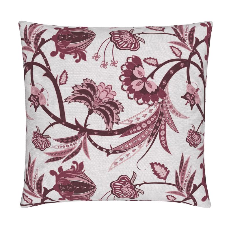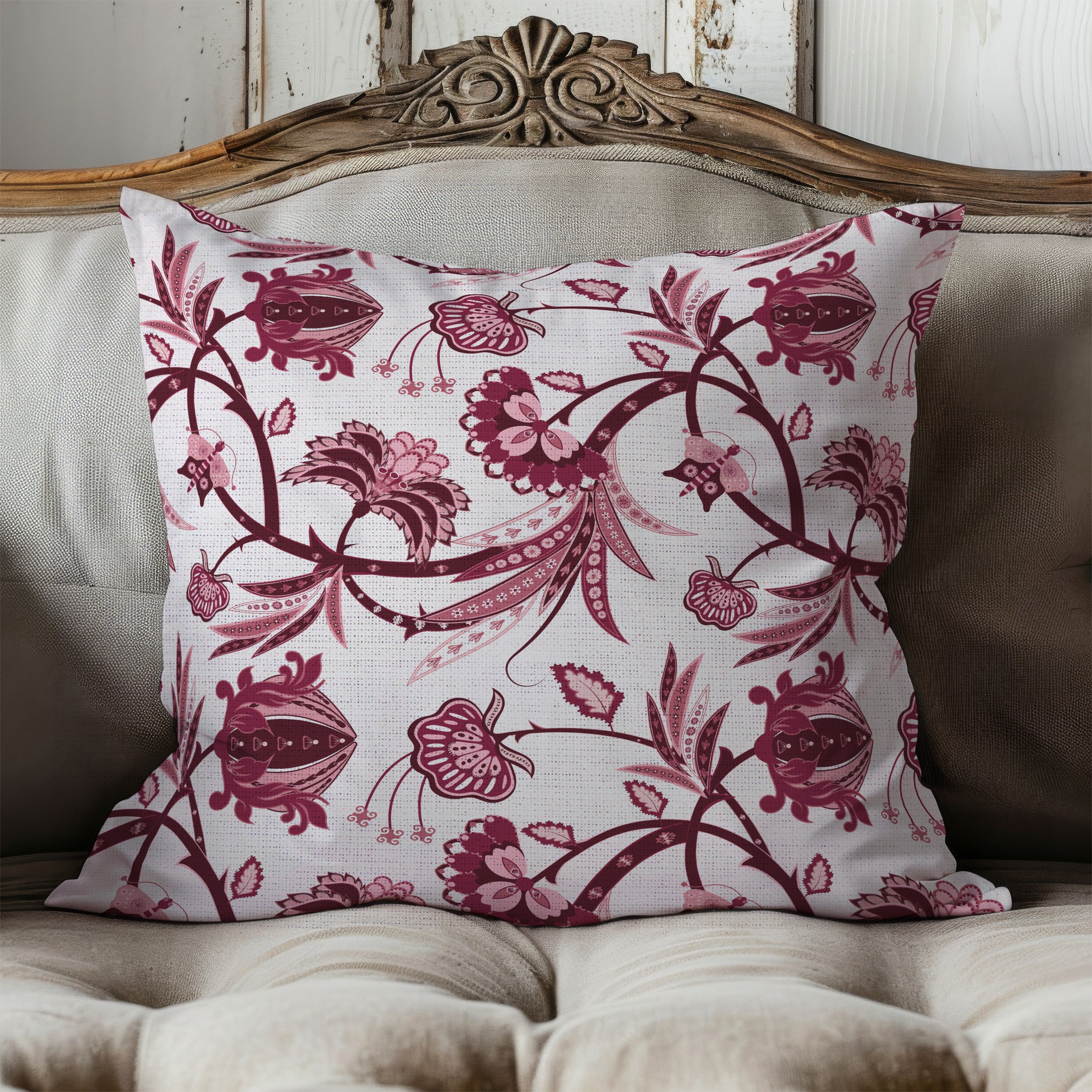 Ornate, stylized flowers and leaves in an art nouveau vibe. Shades of pink and rose.