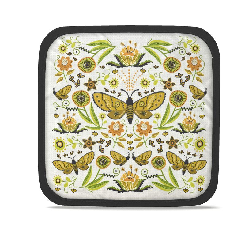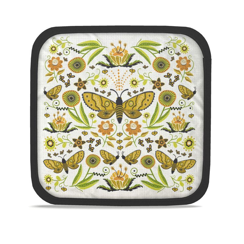 Hand drawn moths, flowers and leaves in a soft, earth tone color palette.