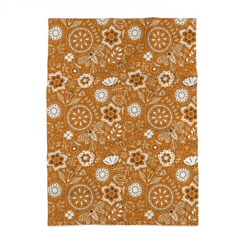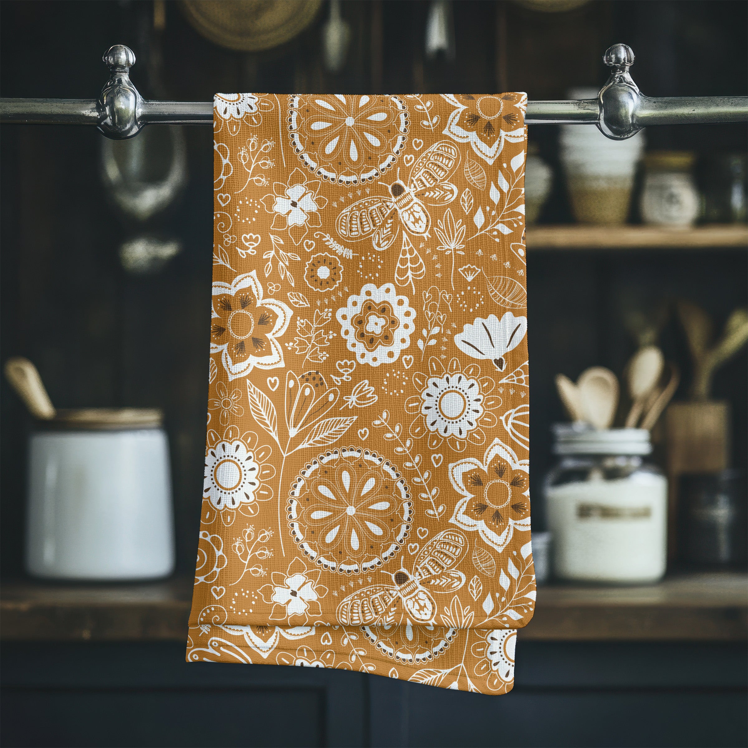 Hand drawn flowers in a lovely warm orange color. Perfect for the fall kitchen and looks so cozy next to that bowl of caramel apples!