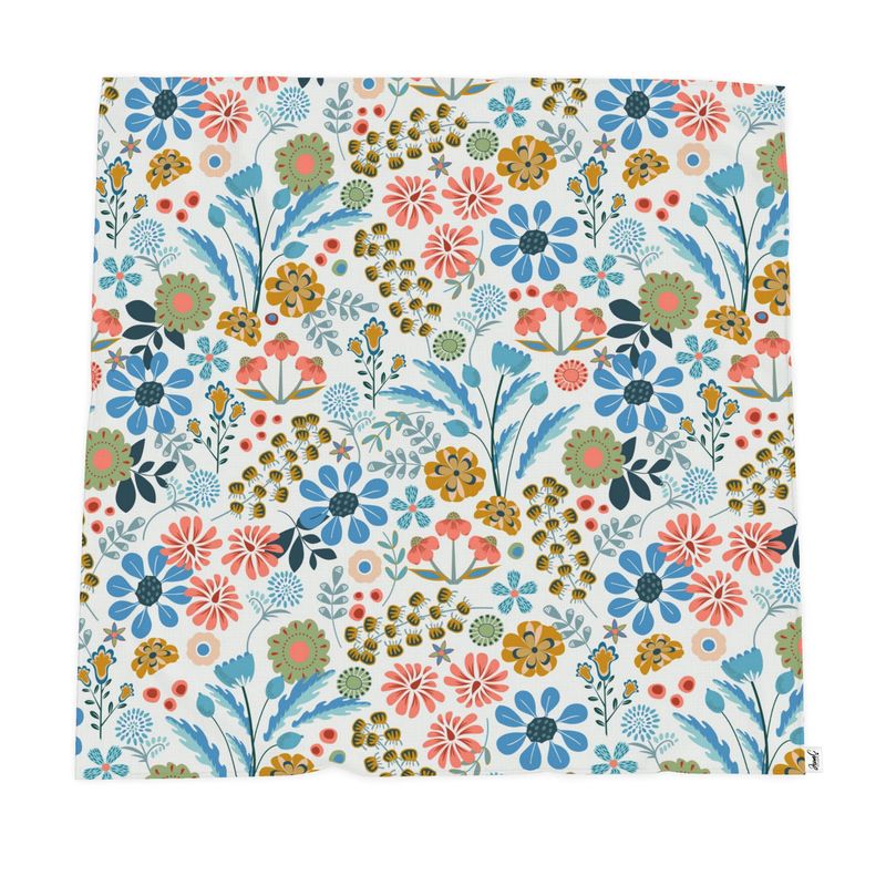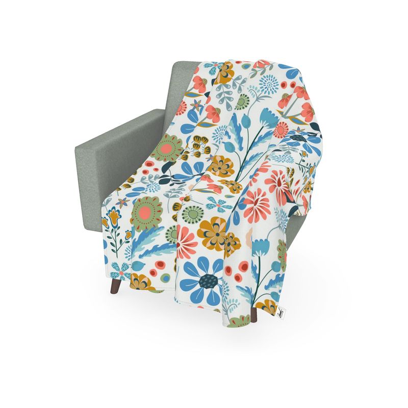 Organic cotton throw with garden of hand drawn multicolored flowers.