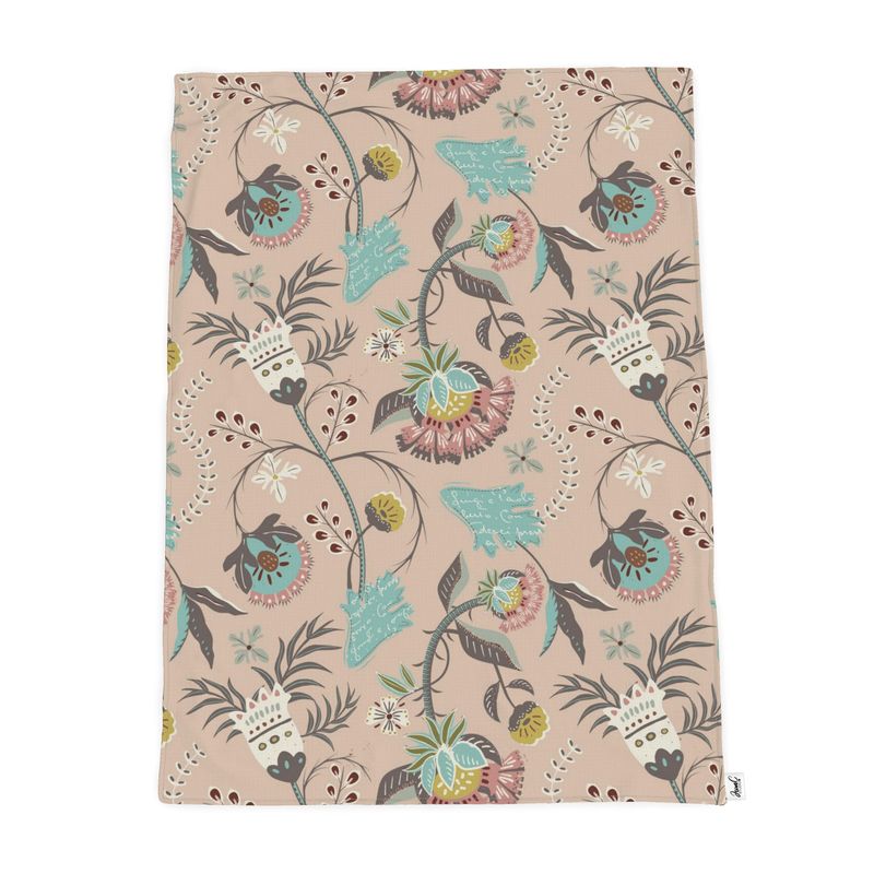 Beautiful hand drawn flowers on an organic cotton throw. The palette is muted with a peachy sand background and blue and brown leaves and flowers.