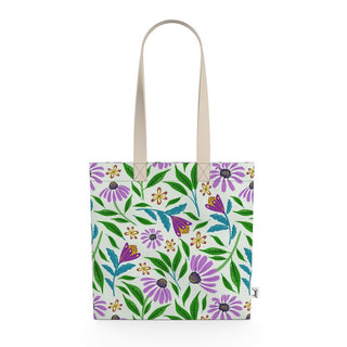 Image of tea towel with purple coneflowers and green and blue leaves on a light green background