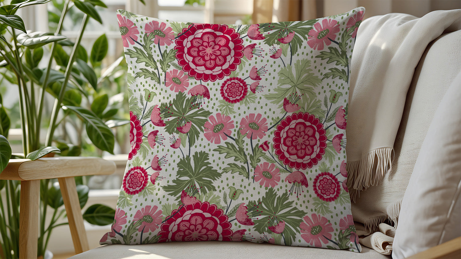 Hand drawn blossoms and leaves in a lush garden color palette of reds, pinks and green.