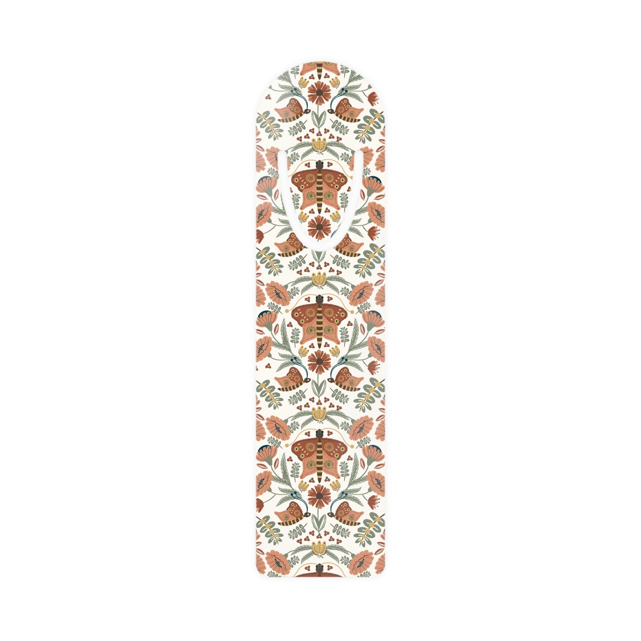 A slim, elegant aluminum bookmark finished with a soft rounded top and a U-shaped slot to gently secure your page. The front showcases a warm, vintage-inspired butterfly and floral pattern in terracotta, sage and cream. Feather-light at just 9 g, it slips into novels, journals, or recipe books without adding bulk. Thoughtful details like the rounded edge and top slot make it easy to grip and position.
