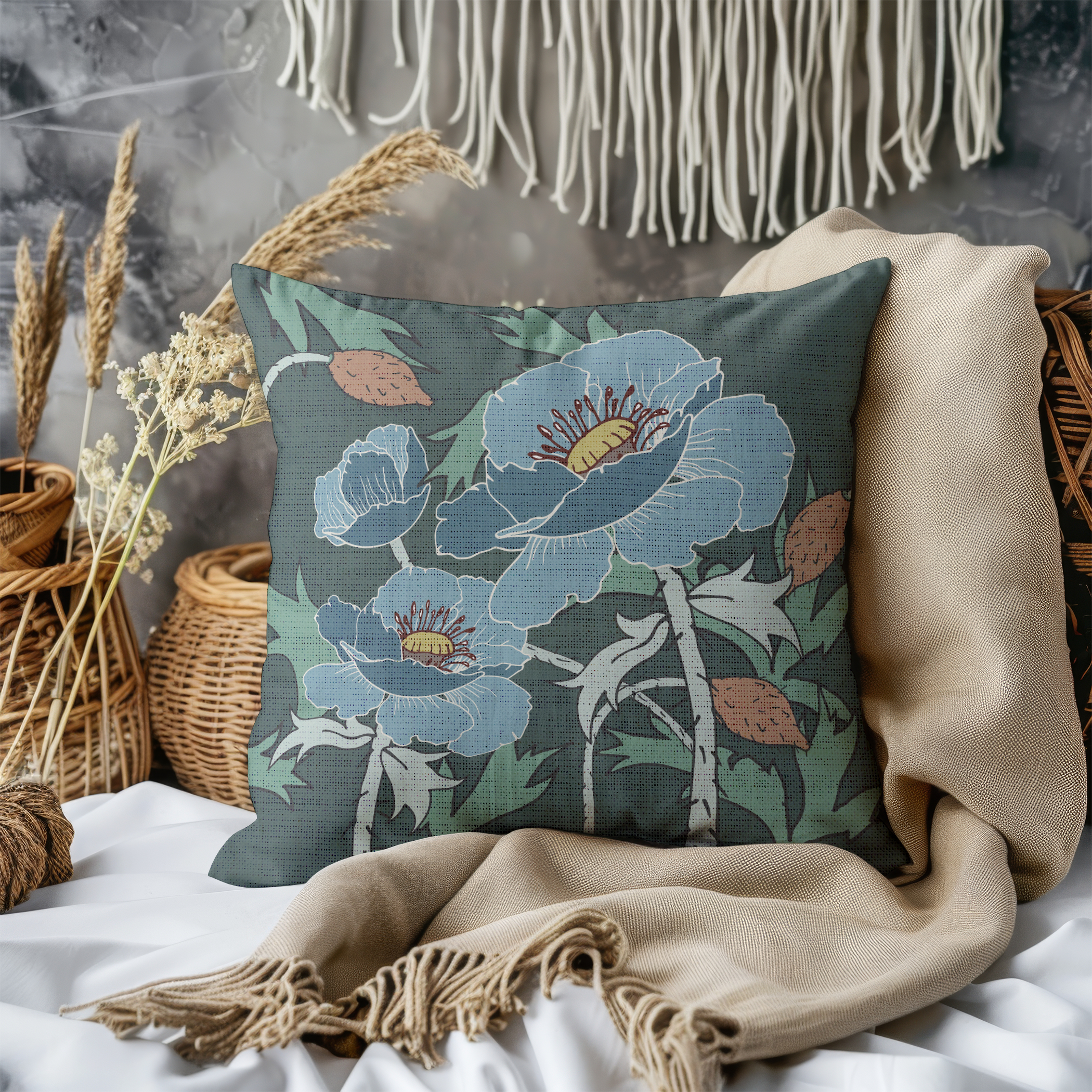 This pillow design features hand drawn poppies, leaves and stems in an earth tone color palette.