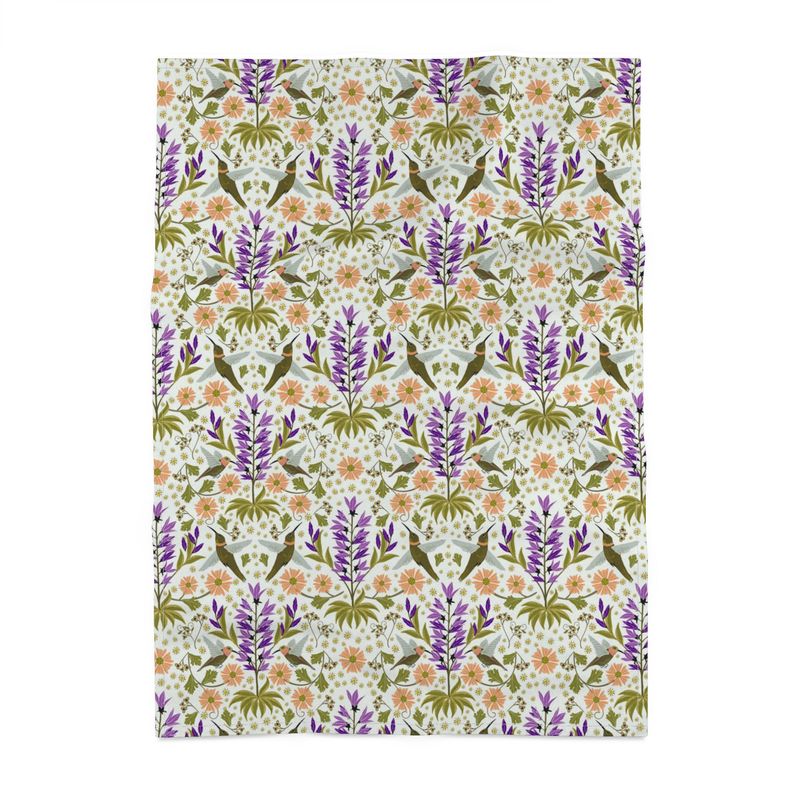 Hand drawn design featuring sweet hummingbirds and lavender salvia flowers. Shades of purple and green with pops of peach.