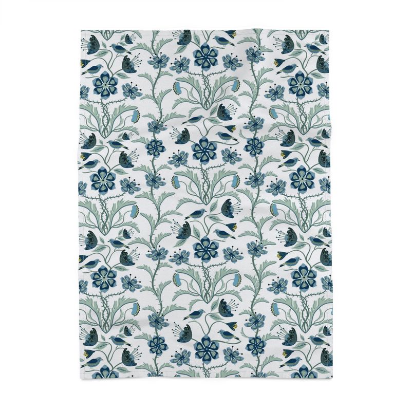 DescriptionHand drawn sparrows and flowers perching in a pretty garden in cool blue and green hues. Floral tea towels can be used for much more than kitchen chores. Wrap up a gift (furoshiki style), use as a placemat, or cover a loaf of bread that you're proofing before baking it. • Size: 19.7 in x 27.6 in (50cm x 70cm) • Design is printed edge to edge on one side About the Fabrics100% Cotton LinenWhen combined, linen and cotton fabrics create the perfect blend of comfort and style. Linen's moisture-wicking and breathable properties complement cotton's softness and versatility, resulting in a fabric that offers the best of both worlds. Half Panama CottonA natural half panama, made from 100% certified organic cotton. It's a durable, heavy, woven fabric with a distinct basketweave texture.